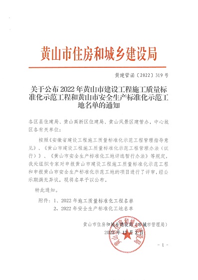 承建的徽州家园项目、歙县人民医院医疗能力提升项目、黄山横江湾凯悦酒店项目、高铁黟县东站站前广场及附属配套工程、黄山市南部城镇群水务调度中心项目、黄山北海路公交综合大楼工程荣获2022年施工质量标准化工程和安全生产标准化工地的殊荣。