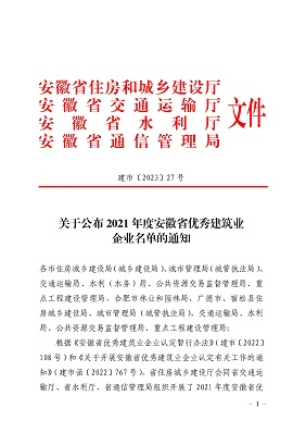 根据《安徽省优秀建筑业企业认定暂行办法》和《关于开展安徽省优秀建筑业企业认定有关工作的通知》。省住房城乡建设厅会同省交通运输厅、省水利厅、省通信管理局组织开展了2021年度安徽省优秀建筑企业认定工作。