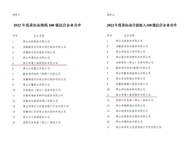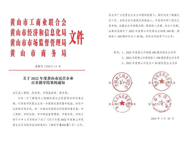 日前,由黄山市工商联、市经信局、市监管局及市商务局联合发布2022年度黄山市民营企业纳税及营销收入百强名单公布,米兰官方网站-米兰(中国)
