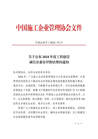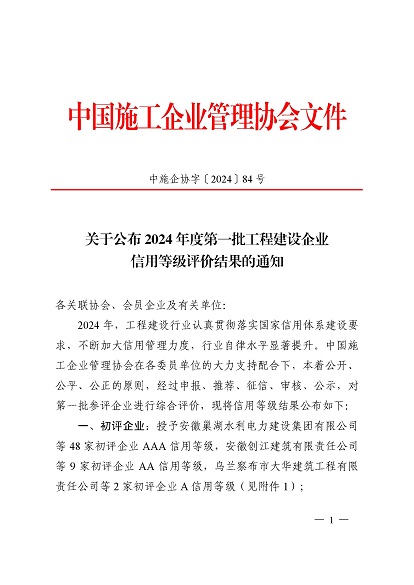 近日,中国施工企业管理协会公布了2024年度第一批工程建设企业信用等级评价结果的通知、工程建设诚信企业家评价结果、工程建设诚信项目经理名单。米兰官方网站-米兰(中国) 顺利通过AAA级信用企业的年审,继续保持AAA信用等级的殊荣。米兰官方网站-米兰(中国) 总经理叶金发获评诚信企业家,项目经理毕星豪获评诚信项目经理。此次荣誉是对米兰官方网站-米兰(中国) 在工程建设领域的综合实力和诚信经营的高度认可。